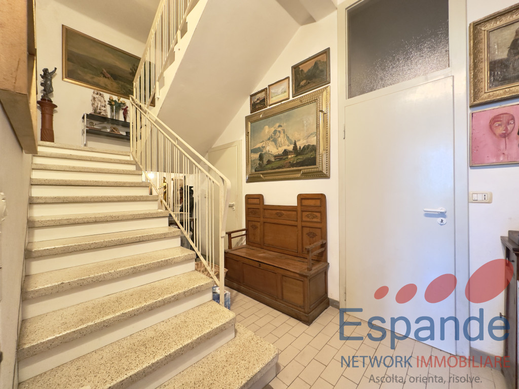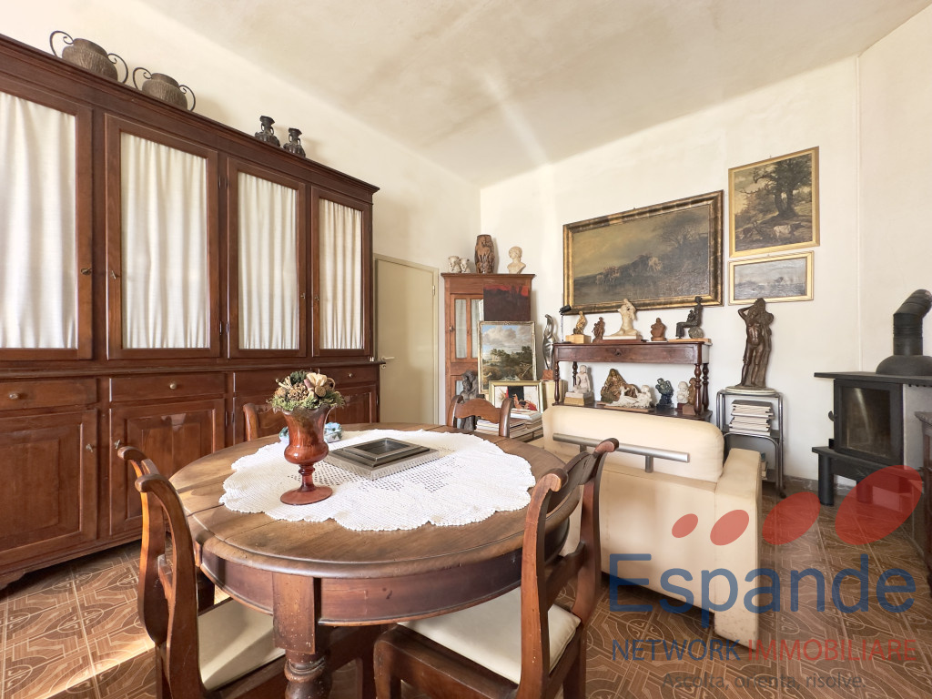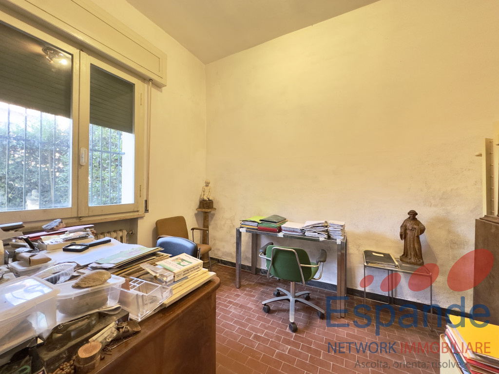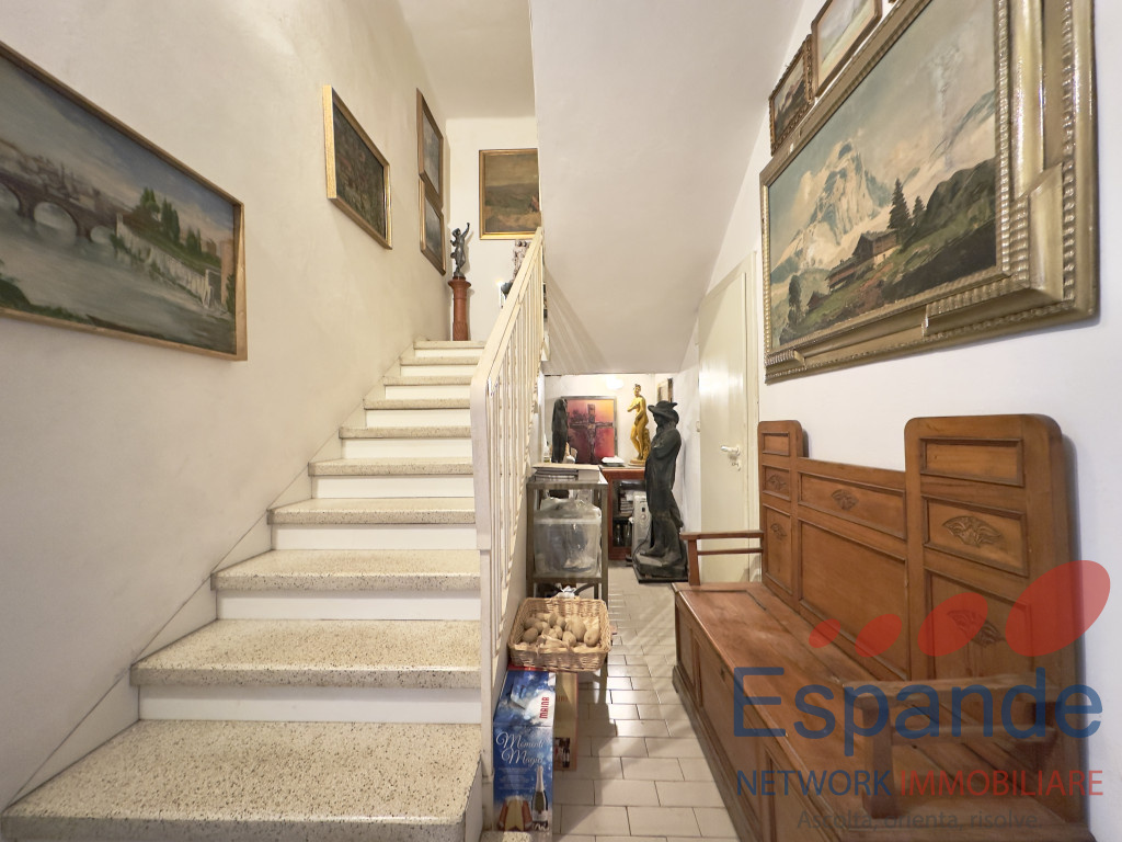 La casa, sviluppata su due piani, si presenta così disposta: al piano terra ingresso (5,4mq) accessibile dal giardino di proprietà , tinello (9mq), n. 4 locali adibiti a ripostiglio (rispettivamente di 6,70mq, 6mq, 2,6mq e 20mq) e vano scala dal quale si accede al piano primo, il quale è così disposto: n. 2 camere da letto matrimoniali (17mq e 15mq), studio finestrato utlizzabile come camera da letto (11mq) , cucina abitabile (11mq) permettente l’accesso al balcone (14,5mq), soggiorno (28mq), n. 2 bagni di cui uno finestrato (3,75mq e 4,60mq) e ripostiglio (2,6mq).