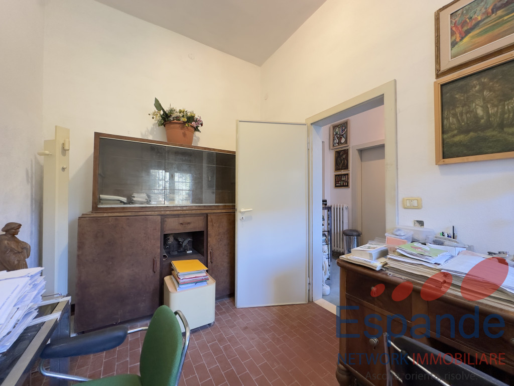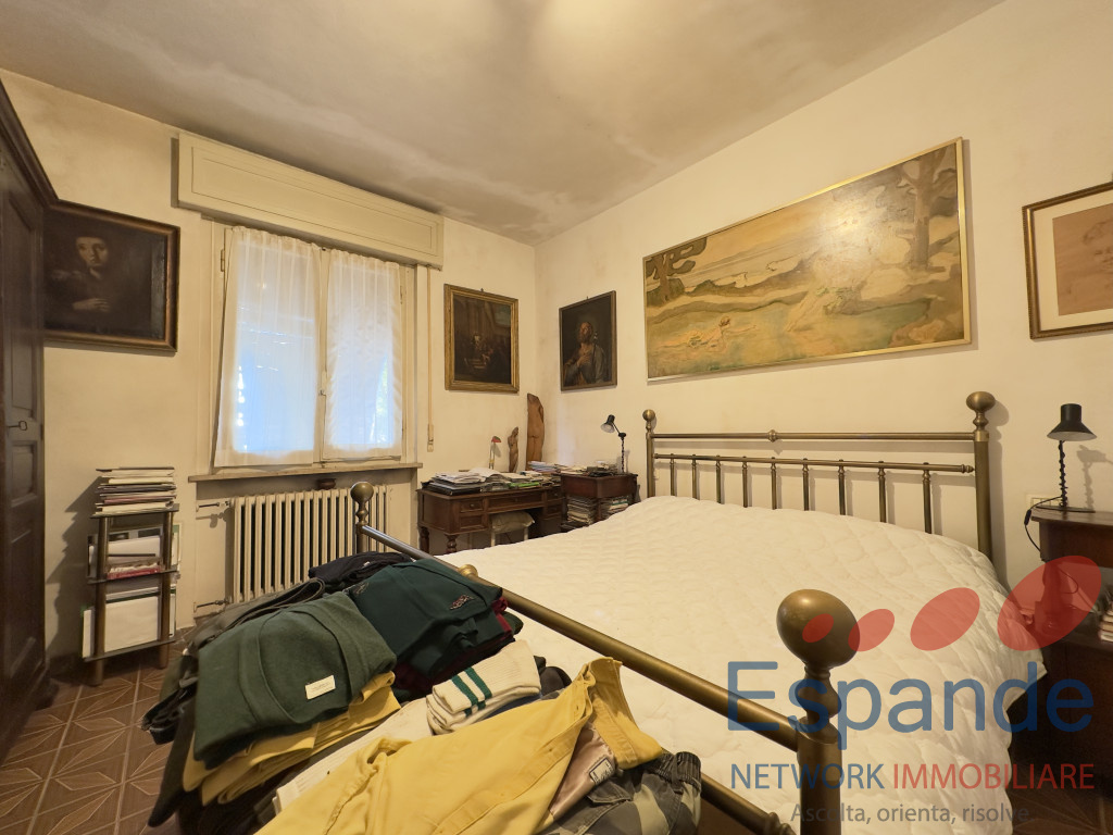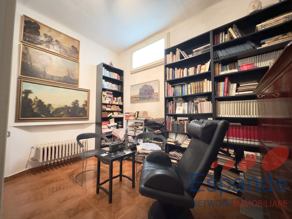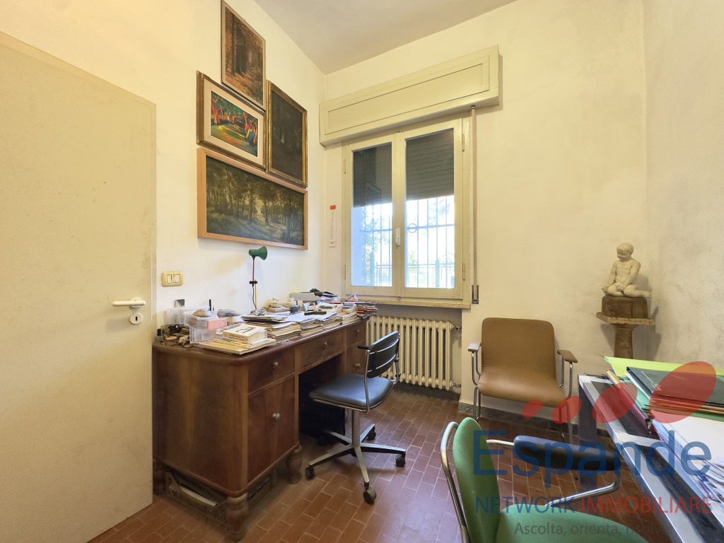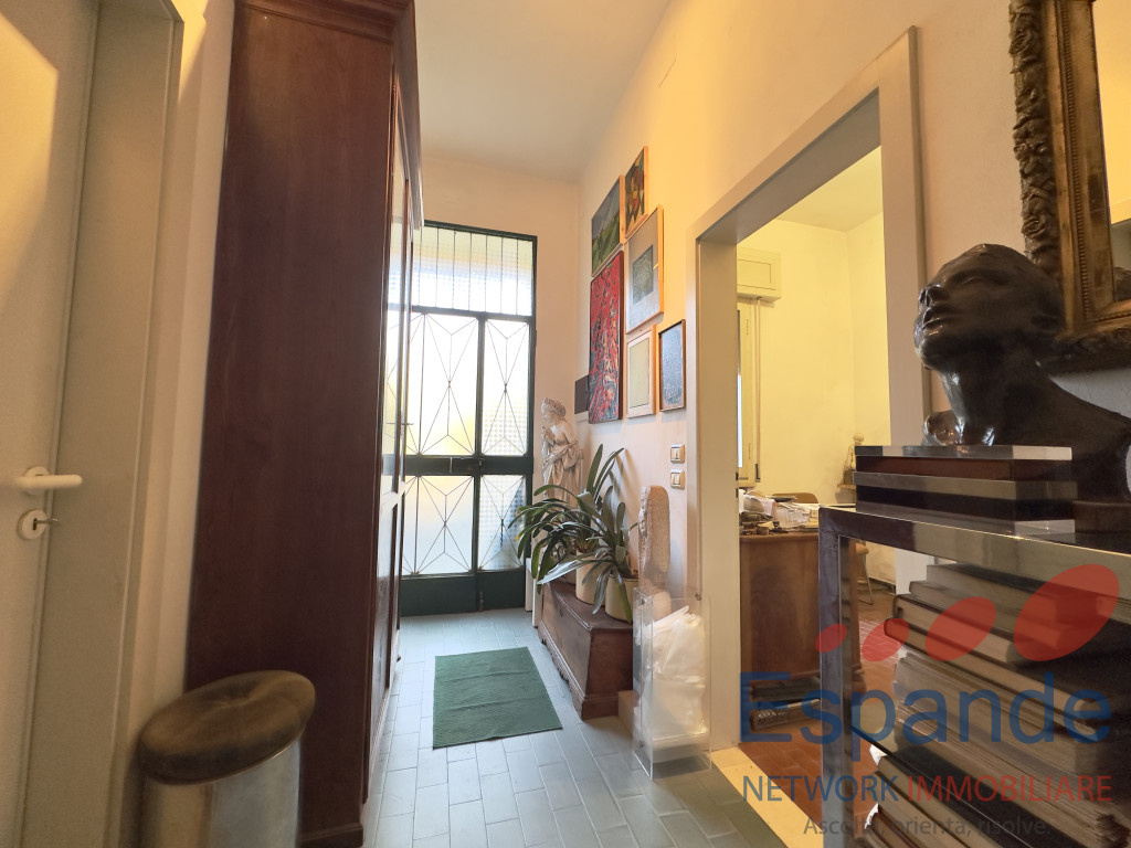 La casa, sviluppata su due piani, si presenta così disposta: al piano terra ingresso (5,4mq) accessibile dal giardino di proprietà , tinello (9mq), n. 4 locali adibiti a ripostiglio (rispettivamente di 6,70mq, 6mq, 2,6mq e 20mq) e vano scala dal quale si accede al piano primo, il quale è così disposto: n. 2 camere da letto matrimoniali (17mq e 15mq), studio finestrato utlizzabile come camera da letto (11mq) , cucina abitabile (11mq) permettente l’accesso al balcone (14,5mq), soggiorno (28mq), n. 2 bagni di cui uno finestrato (3,75mq e 4,60mq) e ripostiglio (2,6mq).